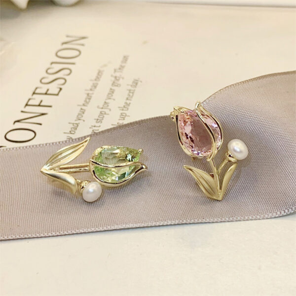 Hãy tưởng tượng, trên nền áo sơ mi mềm mại, hay trên chiếc blazer trang nhã, chiếc trâm cài hoa tulip khẽ đậu, tỏa sáng dịu dàng. Hình ảnh hoa tulip, biểu tượng của sự hoàn hảo và tình yêu vĩnh cửu, được tái hiện một cách tinh tế, với những đường nét mềm mại và uyển chuyển. Màu xanh tươi mát của pha lê, kết hợp với vẻ đẹp thanh lịch của ngọc trai tự nhiên, tạo nên một tổng thể hài hòa và đầy lôi cuốn.