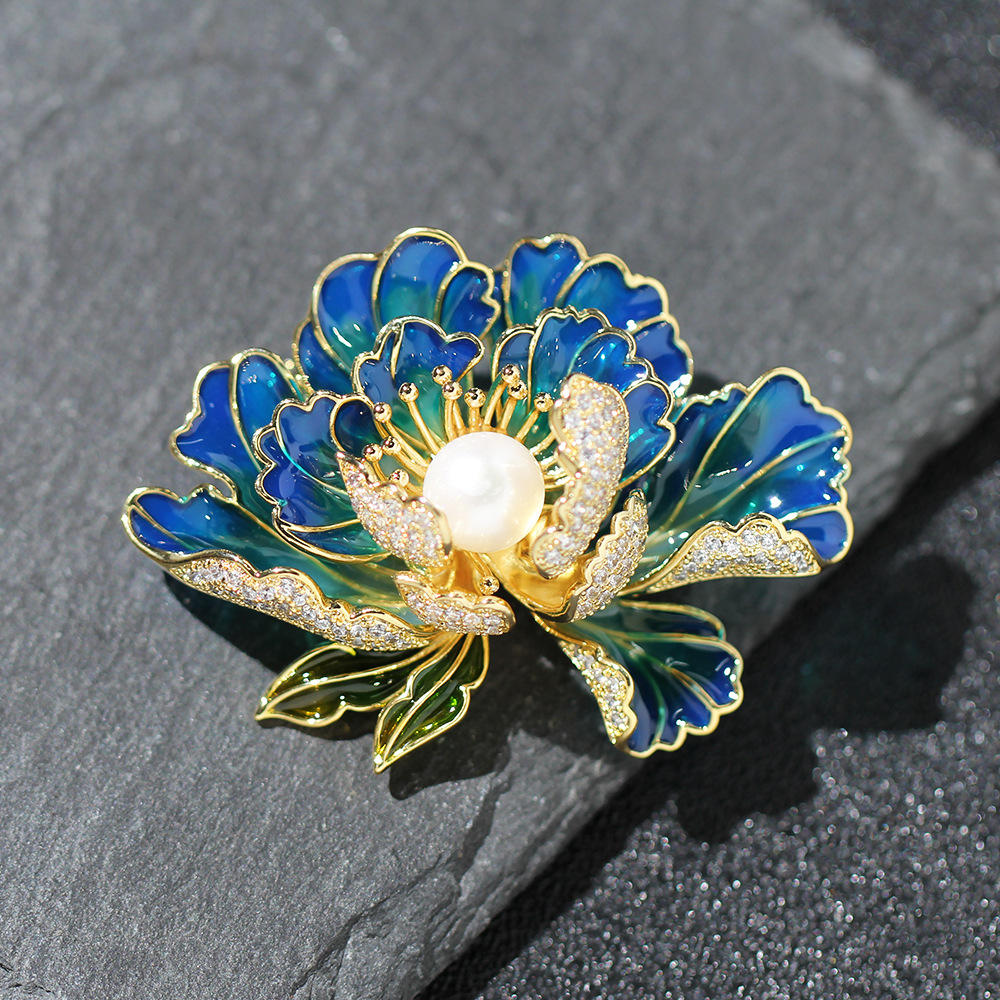 Điểm nhấn của trâm cài áo là những viên ngọc trai tự nhiên, sáng lấp lánh, được đính kết khéo léo trên những cánh hoa mẫu đơn xanh được tráng men tinh xảo. Sự kết hợp hài hòa giữa sắc xanh thanh lịch và vẻ đẹp tinh khiết của ngọc trai tạo nên một món trang sức vừa sang trọng, vừa quý phái.