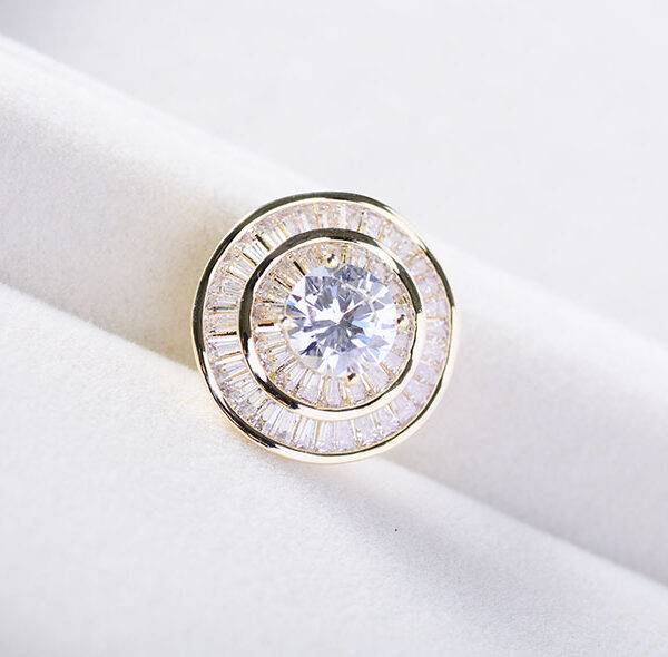 Hãy tưởng tượng, trên nền áo vest thanh lịch, hay trên chiếc áo sơ mi đơn giản, chiếc cài áo cúc áo khẽ đậu, tỏa sáng lấp lánh. Hình ảnh cúc áo được tái hiện một cách tinh tế, với những đường nét mềm mại, tỉ mỉ. Những viên pha lê sáng bóng được đính kết khéo léo, tạo nên hiệu ứng lấp lánh đầy mê hoặc, thu hút mọi ánh nhìn. Thiết kế gọn gàng, thanh lịch mang đến vẻ đẹp cổ điển và sang trọng.