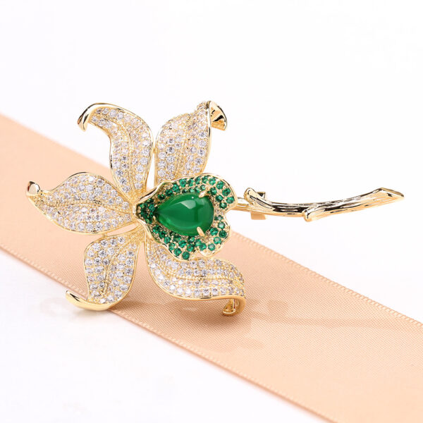Điểm nhấn nổi bật của cài áo là những viên đá kim cương nhân tạo cao cấp, lấp lánh tỏa sáng, được đính kết tinh xảo trên thiết kế hoa độc đáo. Màu xanh lục bảo của đá quý mang đến vẻ đẹp sang trọng, quý phái và đầy mê hoặc.