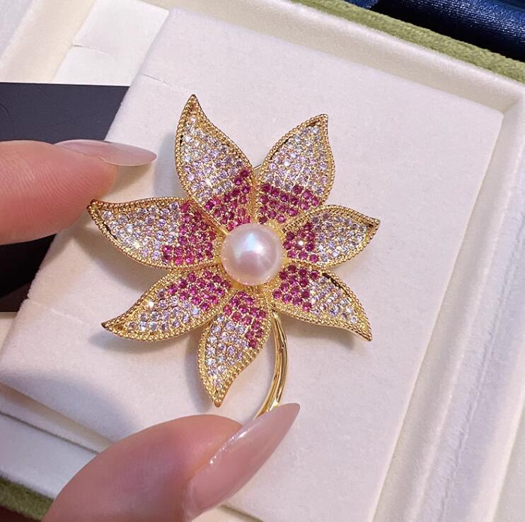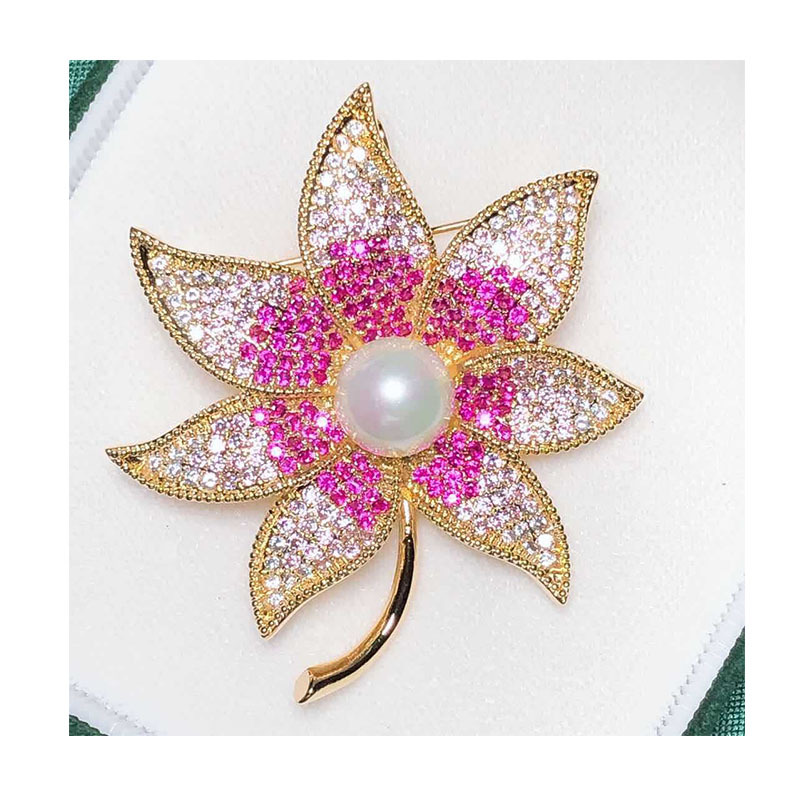 Trâm Cài Áo Lá Phong Đính Kim Cương Hồng Ngọc Trai Cao Cấp