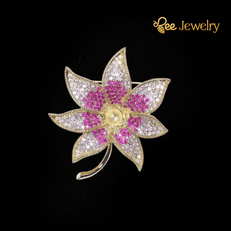 Trâm cài áo lá phong kim cương hồng đính ngọc trai cao cấp là một tác phẩm nghệ thuật tinh xảo, thể hiện sự kết hợp hài hòa giữa nét cổ điển và hiện đại. Hình dáng lá phong năm cánh được cách điệu mềm mại, với phần viền ngoài cùng màu vàng ánh kim sang trọng, tiếp theo là lớp đá trắng lấp lánh như những viên kim cương nhỏ, tạo hiệu ứng bắt sáng rực rỡ. Điểm nhấn trung tâm của chiếc trâm cài áo lá phong là viên ngọc trai trắng ngà, sáng bóng, tượng trưng cho vẻ đẹp thuần khiết và quý phái.