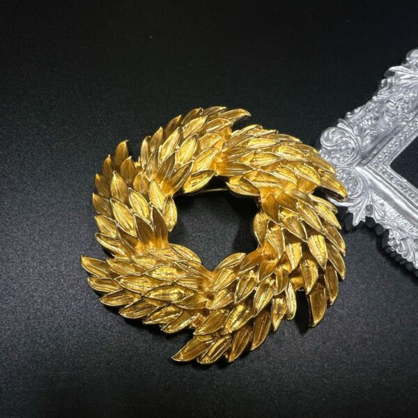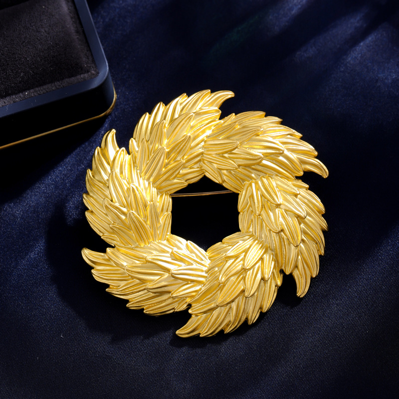 Chiếc trâm cài áo hình vòng hoa lúa này được chế tác tỉ mỉ từ hợp kim cao cấp, trải qua quá trình xi mạ vàng 24K chắc chắn, bền màu, mang đến vẻ đẹp sang trọng và quý phái. Hình ảnh vòng hoa lúa tượng trưng cho sự sung túc, ấm no và những giá trị truyền thống tốt đẹp.